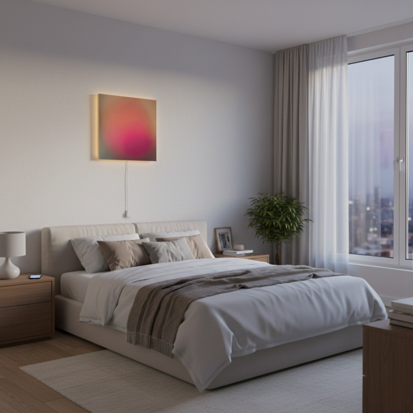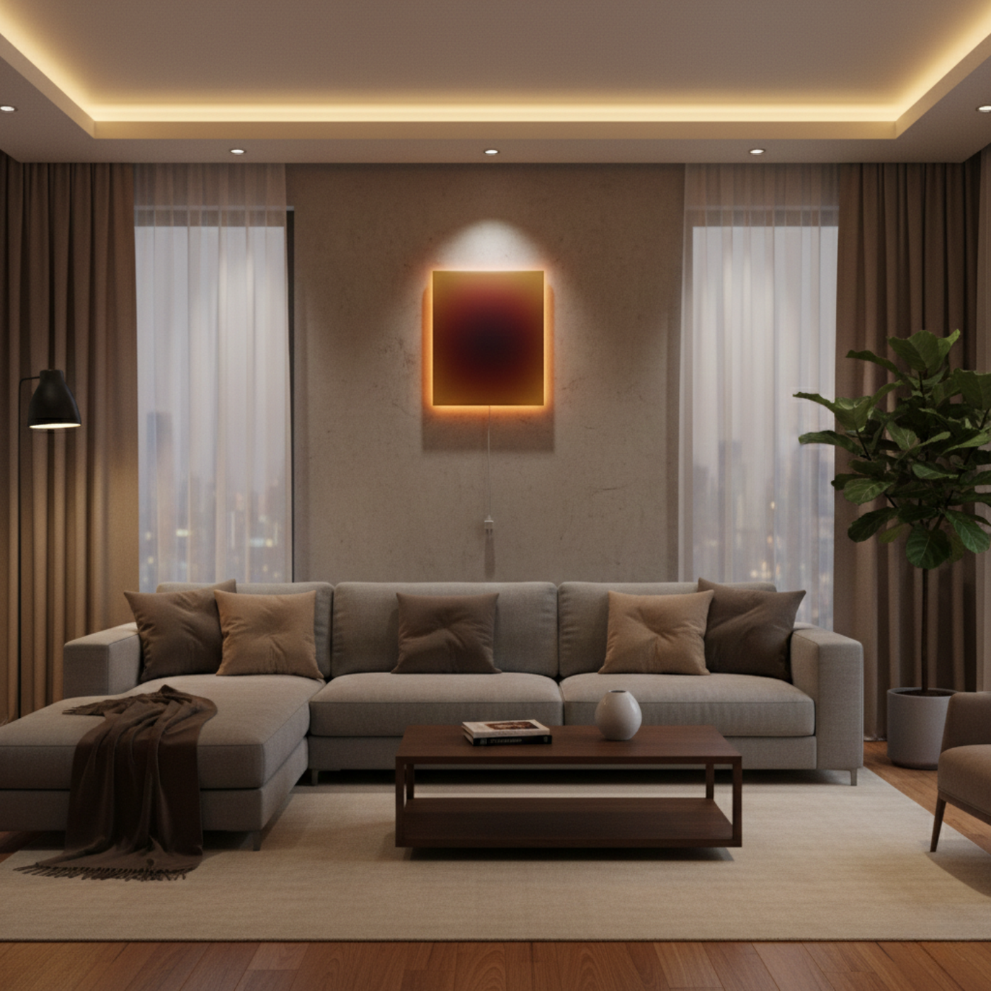 Chroma Aura produces a smooth, diffused ambient glow intended to shape mood and depth rather than provide direct task lighting. It’s ideal for living spaces, bedrooms, studios, and design-led interiors.