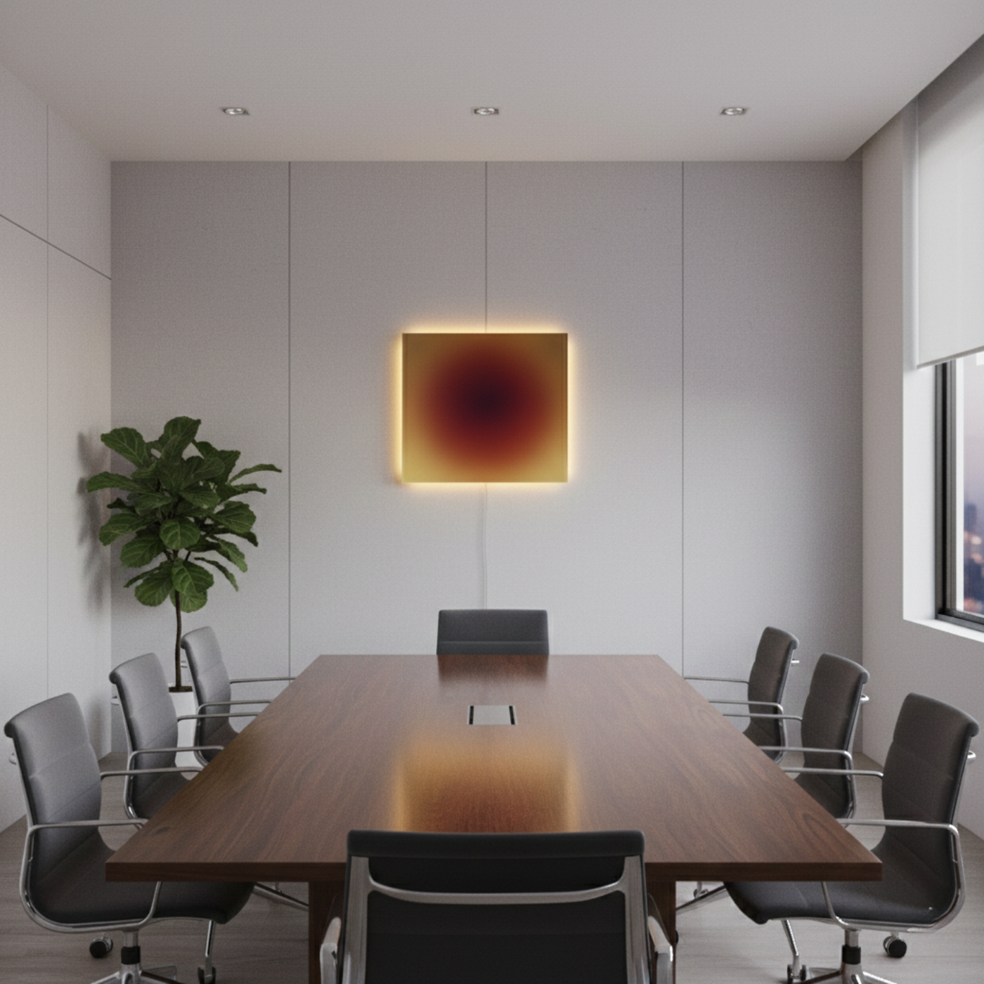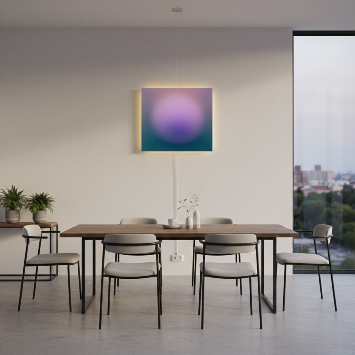 The soft gradient glow radiates like a quiet sun suspended on the wall, casting warmth that shifts with the surrounding light. Each piece is a luminous canvas that transforms the feeling of a room. Plug it in and it becomes both sculpture and illumination, inviting stillness and depth into your space. Whether displayed on its own or paired in series, The Chromatic Aura Wall Series creates an experience that feels intentional and alive. Details Mixed-media illuminated art panel Gradient acrylic surface with soft diffused glow Warm Plug- In LED light
